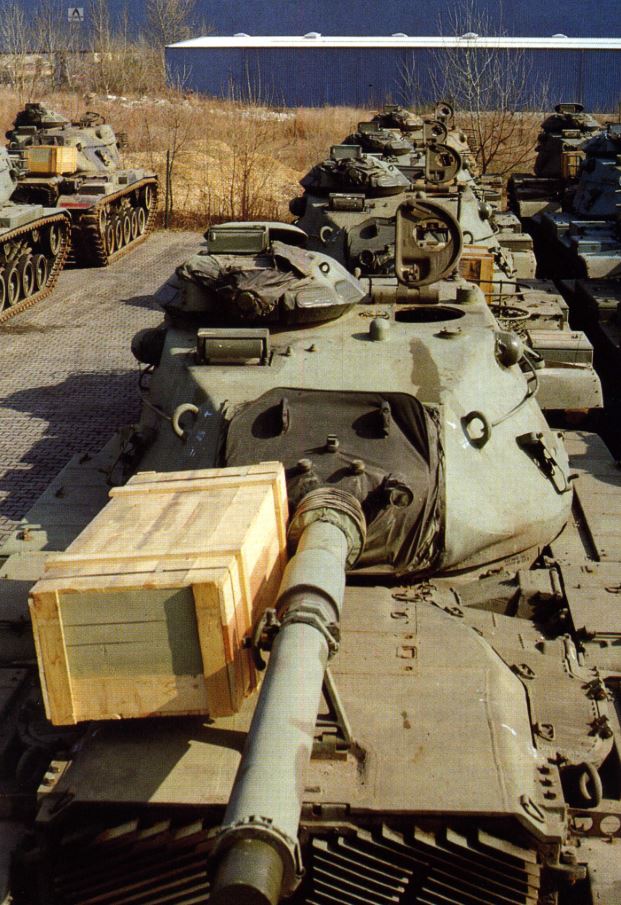 M-47E1: modificado en España para adaptarle el grupo motopropulsor del M-60; cañón de 90 mm.; algunos M-47 adquiridos posteriormente permanecen almacenados sin que se les haya sustituido el motor. M-47E2: igual que el anterior, pero con cañón Rheinmetall de 105 mm. M-48A5E2: cañón de 105 mm.; lleva el mismo grupo motopropulsor que los anteriores. M-48A3: cañón de 90 mm.; hay 16 ejemplares en la Infantería de Marina. AMX-30 E: se encuentra tal y cómo fue fabricado, bajo licencia, por la EN Santa Bárbara. AMX-30 ER 1: primera modificación realizada en España, consistente en sustituir la transmisión original por la norteamericana CD-850-6A AMX-30 EM2: segunda modificación española; incluye la sustitución de todo el grupo motopropulsor así como la dirección de tiro. A efectos logísticos esta lista podríamos resumirla en lo siguiente: • Un grupo motopropulsor mayoritario: el formado por el motor AVDS-1790-2A (carros M-47E1 y E2, M-48A5E2 y también en los futuros M-60) y la transmisión CD-850-6A (en todos los anteriores e igualmente en el AMX-30ER1). • Dos cañones de 105 mm. mayoritarios: M-68 en los M-48 (excepto en la Infantería de Marina) y F-l en los AMX-30. Un cañón de 90 mm. en los carros M-47.Carros listos para el embarque en las instalaciones militares norteamericanas. Las cajas de madera contienen parte del lote de cada carro (herramientas y accesorios). Estas dos circunstancias hacen que un carro como el M-60 no presente especiales problemas logísticos (salvo los respuestos de torre) al usar un grupo motor sobradamente conocido y una gama de munición ya utilizada en los M-48. Ahora bien, la cifra inicial de 420 nuevos carros obliga a destruir unos 480 de los ya existentes, dejando fuera de esta cifra los M-47 sin transformar y los M-41 que ya estaban dados de baja, consistiendo el problema en saber qué vehículos se encontrarían entre ellos. Respecto a los AMX-30, ya estaba en marcha el programa de modernización (AMX-30EM2) con el consiguiente desembolso económico que no podía perderse. En cuanto a los M-48A5 su tecnología es parecida a la de los M-60 pueden ser modernizados hasta un nivel similar, mientras que los M-48A3 resultan inferiores. Por último, los M-47E1 y E2 estaba claro que habían cumplido con creces su servicio militar habiéndose ganado un muy merecido descanso. Así pues, en la elección eran llamados a capítulo factores tales como la existencia de programas nacionales, el número de variedades de carros que el ET estaba dispuesto a mantener y la búsqueda del mayor grado de operatividad posible. A estos factores había que añadir que los 420 M-60 se desglosan en 260 M-60A3 TTS y 160 M-60A1 (versión tecnológicamente más inferior). La decisión final ha consistido en solicitar un menor número de carros, quedando el futuro parque del siguiente modo: -Se aceptan 260 M-60A3 TTS y 50 A1. -Se mantienen los 164 M-48A5 existentes debido a su grado de operatividad y serán destruidos los 16 M-48A3 de la Infantería de Marina. -Respecto al programa de AMX-30 continuará el programa de modernización para un total de 150 carros y se conservan 60 de la versión ER 1, destruyéndose 10 de estos ERI y los 79 AMX-30 restantes sin transformar. -Desaparecen los 375 M-47 (El y E2). Particularmente, considero muy acertado el mantener la totalidad de los M-48A5, pues con la modernización adecuada, pueden igualar las capacidades de los M-60 A3 TTS. En el caso de los AMX-30 hubiera sido preferible la modernización de los 210 restantes hasta la versión AMX-30 EM2, pero los presupuestos priman sobre otras consideraciones. Ahora bien, ¿qué ventajas supone el carro M-60 frente al resto de los que hay en servicio? Analicemos los distintos factores teniendo en cuenta dos premisas: 1.- Nos referiremos al modelo M-60A3 TTS por tratarse del mayoritario y por ser su nivel de operatividad el que se propone para los M-60A1. 2.- Lógicamente nos centraremos en el nivel que alcanzarán los carros una vez realizadas las necesarias revisiones de 42 escalón. Salimos con esto al paso de algunas críticas aparecidas al llegar los vehículos a las unidades, opiniones que deben esperar hasta que los especialistas realicen su trabajo. Movilidad Suele tomarse como magnitud la relación entre la potencia en caballos del motor y el peso del carro en toneladas (potencia específica). En este caso la mayor relación la da el AM X-30EM2 (23 hp/ton) quedando el M-60 con 14,3 hp/ton. Esta diferencia radica no sólo en el mayor peso del último sino al nuevo motor MTU del AMX-30. Se deduce pues de ésto la necesidad de un nuevo motor para los M-60, motor que ya parece estar decidido y que le proporcionará una potencia de 900 hp. También quedan por delante el M-47 y M-48. Respecto a la presión específica (el peso del carro repartido sobre la parte de cadena apoyada en el suelo indica la capacidad para desplazarse por terrenos poco firmes) sus 0,87 kg/cm2., están muy próximos a los 0,77 del AMX-30EM2 y resultan igual para el M-48. La capacidad de vadeo (4 m.) es igual en AMX-30 y M-60, muy por delante de los 1,5 del M-48 y M-47. Por lo que hace a la capacidad de franqueamiento de obstáculos no hay diferencias señalables entre todos los modelos.