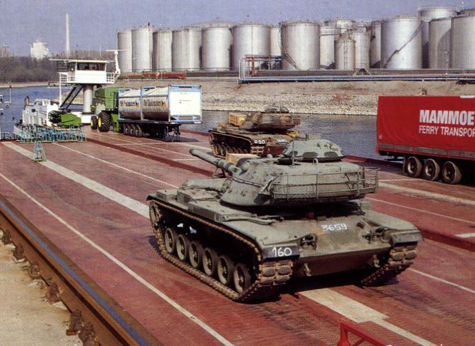 Los vehículos realizaron un crucero por el Rhin en estas barcazas hasta llegar a Rotterdam donde embarcarían con destino a España. Potencia de fuego Viene determinada no sólo por el calibre del cañón, sino por la capacidad de éste de situar los proyectiles en el lugar preciso (la dirección de tiro), las municiones empleadas, capacidad de visión en todo tiempo y posibilidad del tiro en marcha. A igualdad de calibres (105 mm.), tenemos que el cañón norteamericano M-68 admite mayores presiones en recámara que el francés del AMX-30, el F-l (no incluído el cañón alemán Rh-105/30 de los M-47E2 por estar muy limitado en el ET). La presión en recámara es importante pues, cuanto mayor sea la admisible, mayores velocidades iniciales se les podrá dar a los proyectiles de energía cinética (el otro tipo de munición empleada, de carga hueca, no se ve afectada por ella). Quizás en algunas tablas teóricas puedan verse valores similares para los dos cañones citados, pero hasta la hora la experiencia ha mostrado sólo una realidad: la de los M-60 israelíes destruyendo los T-72 sirios con proyectiles de energía cinética durante la última batalla del Líbano (1982). Respecto a direcciones de tiro, las más avanzadas son las de los M-60A3 TTS y AM X-30EM2, prácticamente iguales en lo referente a los parámetros que tienen en cuenta, y a la utilización en ambos casos de una cámara termográfica asociada a ellas. Este sistema de visión para tirador y jefe de carro las sitúa por delante de los del resto de los carros en servicio, que emplean intensificadores de luz. La diferencia que coloca por encima al M-60 es la estabilización del arma principal, que permite la adquisición y seguimiento de objetivos cuando el carro está en movimiento, así como el disparo en determinados terrenos. Es el único carro en servicio en el ET con esta capacidad.