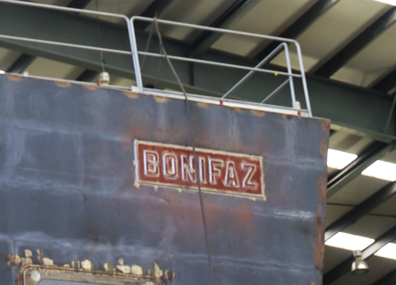 Detalle del nombre de la futura fragata “Bonifaz”, que recuerda al almirante cántabro, que fue decisivo para la Reconquista de Sevilla. (foto Julio Maíz)