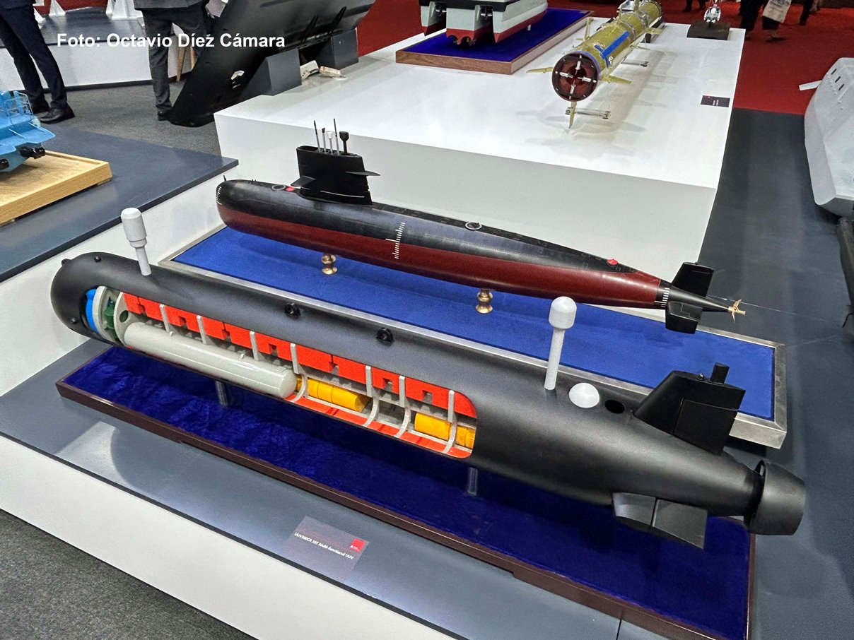 La maqueta del UUV300CD se exponía junto a la de un submarino convencional, lo que permite comparar las formas de uno y otro diseño de China. (Octavio Díez Cámara)