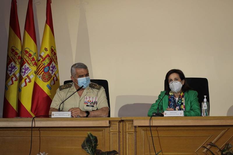 Fotografía: La ministra de Defensa Margarita Robles y el Jefe de Estado Mayor del Ejército de Tierra, General de Ejército D. Francisco Javier Varela Salas durante la inauguración de la jornada “El Ejército de Tierra y los Retos Futuros” (Ministerio de Defensa)
