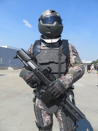 Del mismo sabemos, analizando lo que hemos podido ver y de la poca información que oficialmente se nos ha dado, que conjuga, además de un nuevo fusil de asalto con líneas compactas futuristas, un casco con protección antibala que cubre buena parte de la cara para hacerlo más integral, una visera anti laser para los ojos y una prenda antibalas -armadura táctica la denominan en Rusia- basada en placas rígidas realizadas con fibras de polietileno muy ligeras y resistentes, que serían capaces de, como se dice oficialmente, hacer frente a armas que disparen las contundentes municiones del 12,7x99 mm. (.50 Browning). Sería algo bastante exagerado, aunque no imposible; las placas son pequeñas y se superponen parcialmente entre si en la parte frontal para facilitar los movimientos y flexión del que lleva el conjunto Sotnik, completando la protección otras más pequeñas y delgadas en puntos como la parte superior de brazos y piernas.