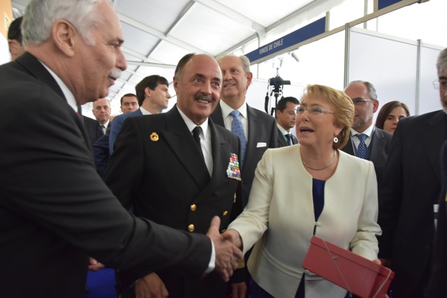 Fotografía: La presidente Bachelet saluda al Alte Gamboa de Abimde en Exponaval