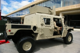 En el estand de AM General en FIDAE nos encontramos con un M1165A1 Sepc-Ops, plenamente equipado con una ametralladora M2HB sobre su cabina, una ametralladora MAG58-M240B para el pasajero delantero y varios pedestales adicionales alrededor del vehículo para llevar diversos tipos de armas. AM...