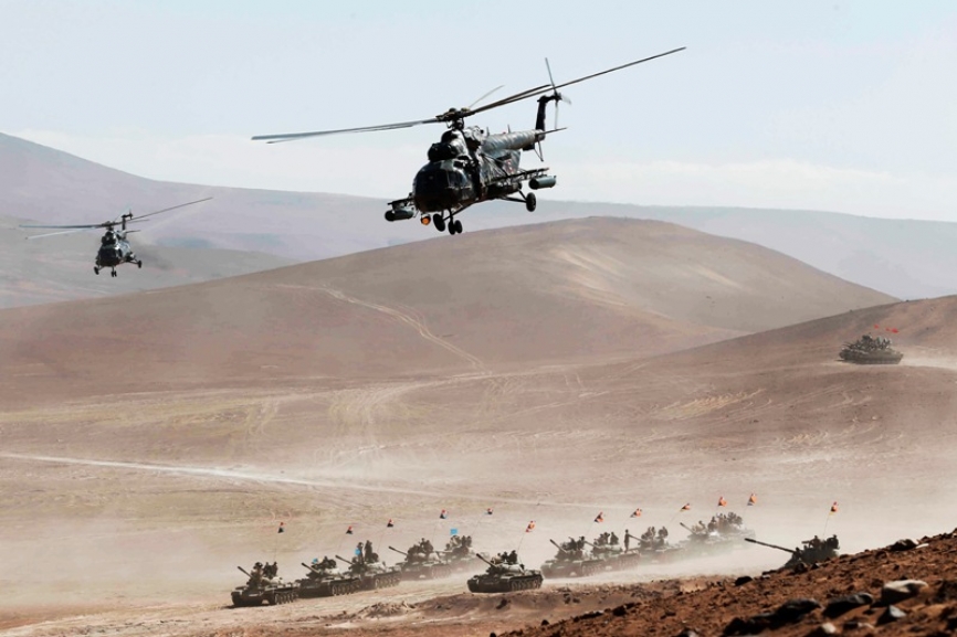 Tanques T-55 de la 6ª Brigada Blindada se aprestan a emprender la marcha bajo la cobertura de dos Helicópteros de Transporte y Combate Mi-171Sh Hip H.(Ministerio de Defensa del Perú)
