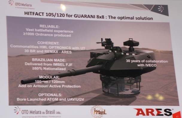 Cambiando al tercio del equipamiento terrestre, los responsables comerciales de la firma transalpina también pusieron el acento en un programa terrestre para el Ejercito de Brasil, el de dotar al blindado 8x8 Guarani de una torre artillada con un cañón de 105 m/m, e incluso de 120 m/m, basada en la OTO Melara L/52 Hitfact de 105m/m.Para cumplir con este futuro contrato se ha creado un consorcio formado por la firma italiana y Oto Melera do Brasil y ARES, que dotará al referido blindado, que a su vez es una versión local de la plataforma de Iveco, de una contundente potencia de fuego, y cuyo ensamblaje final se realizaría en una nave de la referida FJF. (Julio Maíz)