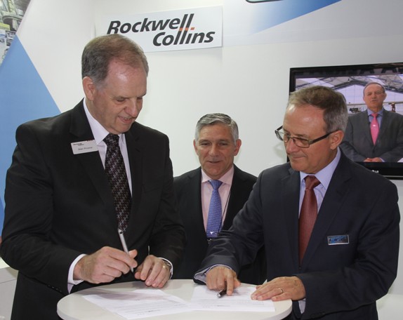 La firma del acuerdo, que se ha efectuado en el stand de la CIAC, ha tenido como protagonistas principales, al gerente de la CIAC, el general Flavio Enrique Ulloa, y al vicepresidente y director administrativo de Rockwell Collins para latinoamerica, Alan Prowse, ante la presencia del viceministro de Defensa Colombiano, José Javier Pérez Mejía. (Julio Maíz Sanz)