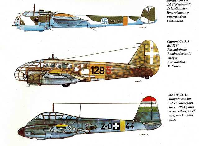 Sin embargo, junto a los aviones y pilotos de la Luftwaffe pelearon otros pertenecientes a los países que se embarcaron en esa aventura al lado del III Reich: Italia, Hungría, Rumanía, Finlandia, Croacia y Eslovaquia. Tampoco faltaron los de algunos Estados que, sin haberle declarado Ia guerra a la URSS, se sumaron al esfuerzo bélico alemán como fue el caso de España y, centrándose en Ia defensa de su propio espacio aéreo, de Bulgaria. Además, pilotos de los países bálticos combatieron en el seno de Ia Luftwaffe formando, en ocasiones, unidades homogéneas e incluso rusos anticomunistas se integraron en el 1º Ostfliegerstaffel volando en aviones capturados al Ejército Rojo. Echemos un vistazo a algunos de los modelos que emplearon estas fuerzas de la mano del ilustrador húngaro János Hangya, un gran especialista en Ia materia.