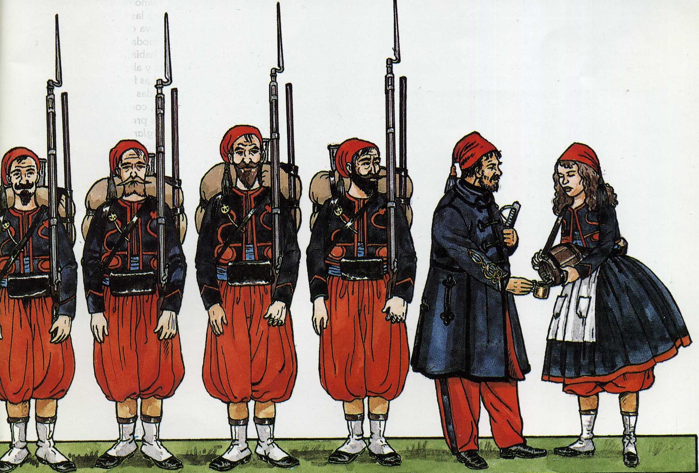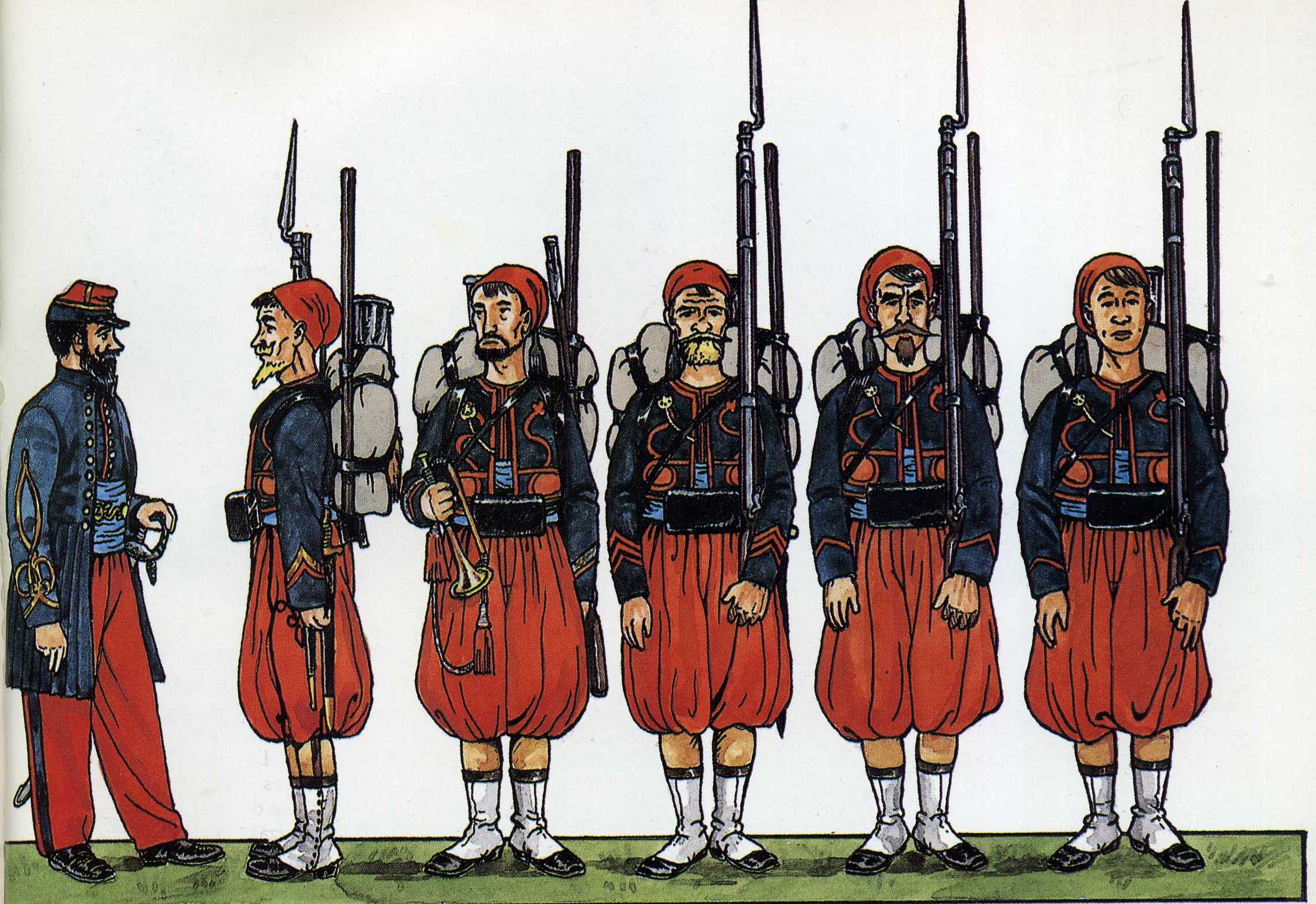 AI declarar Francia las hostilidades a Rusia y formarse l‘Armée d’Orient, los tres regimientos de Zuavos, que ya han recibido su bautismo de fuego en numerosas operaciones en Argelia, contribuyen al cuerpo expedicionario con dos batallones de a ocho compañías cada uno, es decir, unos 2.000 hombres por regimiento, mandados por sus respectivos coroneles.