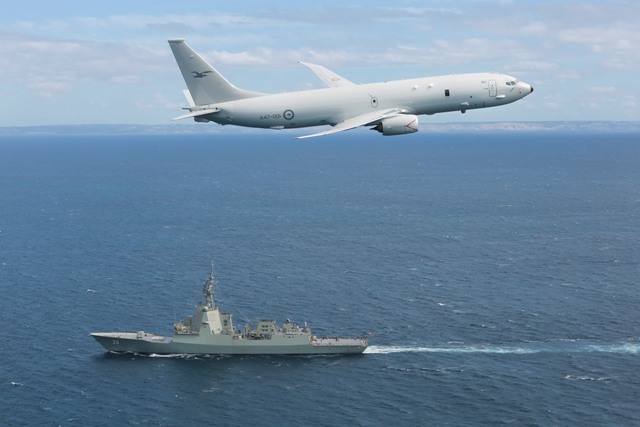 Foto: El primero de los P-8 de la RAAF sobrevuela al nuevo destructor HMAS “Hobart” (DDGH 39) diseñado por Navantia (foto Ministerio de Defensa de Australia).