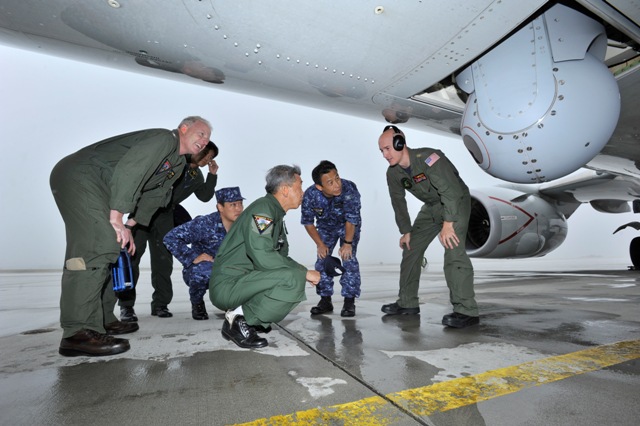 Foto: Un marino de la US Navy muestra a sus colegas japoneses la torreta MX-20HD de L3 Communications Wescam sita bajo el fuselaje del P-8A (foto US Navy).