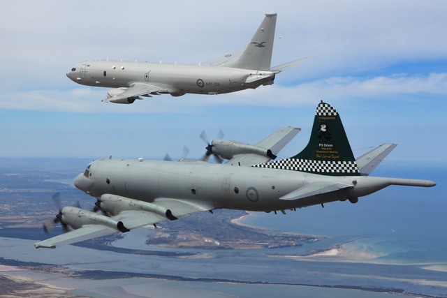 Foto: Un P-3C de la RAAF vuela en formación con el primer P-8A entregado a esa Fuerza Aérea (foto Ministerio de Defensa de Australia).