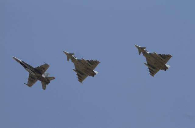 Foto: Formación de EF-18M del Ala 12 y 2 “Eurofighter” italianos (foto Julio Maíz).