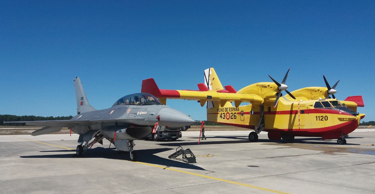 Foto: Además de proteger el medio ambiente en España, el 43 Grupo se despliega en otros países, como es el caso de Portugal. En la imagen, un CL-215T en la Base de Villa Real, junto a un F-16BM de la Força Aérea Portuguesa (foto Aitor Alvarez Bellido).