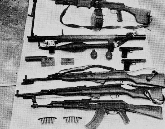Foto: Armas capturadas a guerrilleros nacionalistas en Rhodesia: un fusil ametrallador Degt yarev RPD, lanzagranadas RPGfusiles Simonov y fusil de asalto KalashnikovAK-4 7.
