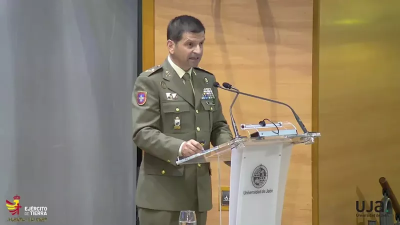 El general de división Fernando Luis Morón Ruiz, director de la DIDOM del MADOC interviene con las conclusiones de las Jornadas “El Ejército y las Operaciones en el Ciberespacio. Retos futuros”, en la Universidad de Jaén, el 7 de mayo de 2024.